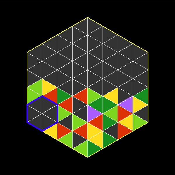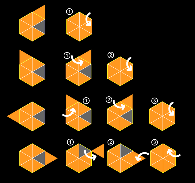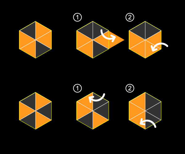 まずは、正六角形の中にパネルが4個・3個ある場合の、無駄のないパネルの動かし方の例をどうぞ。