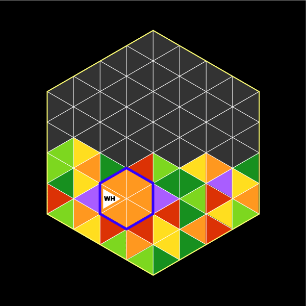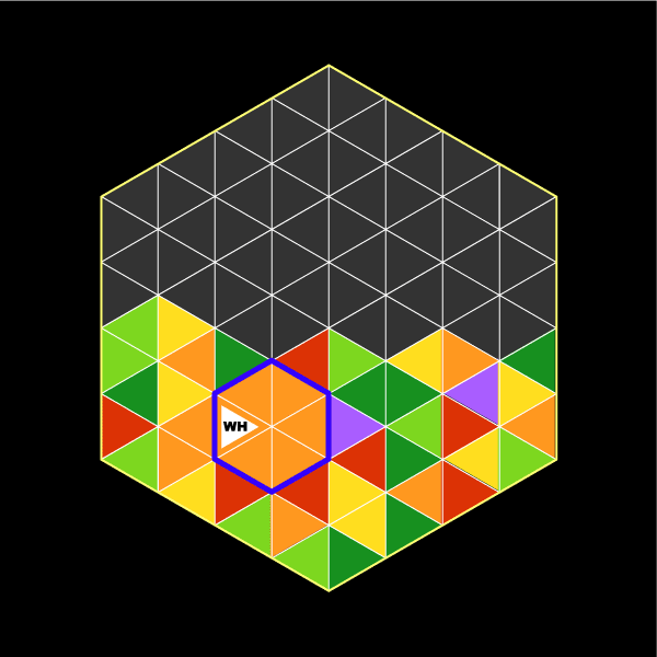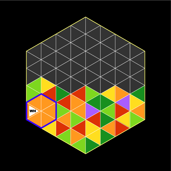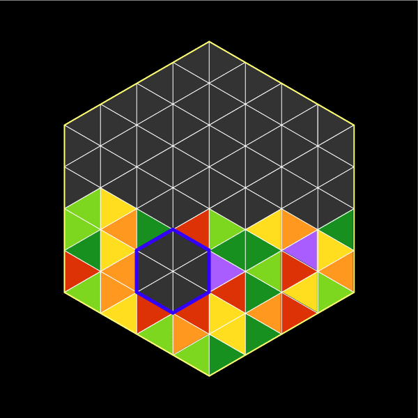 この図の場合の白パネルはオレンジ色なので、このパネルを含んだ正六角形を作ります。この場合の「白パネルと隣接している色」は紫になりますよね。この状態で正六角形が消えると・・・